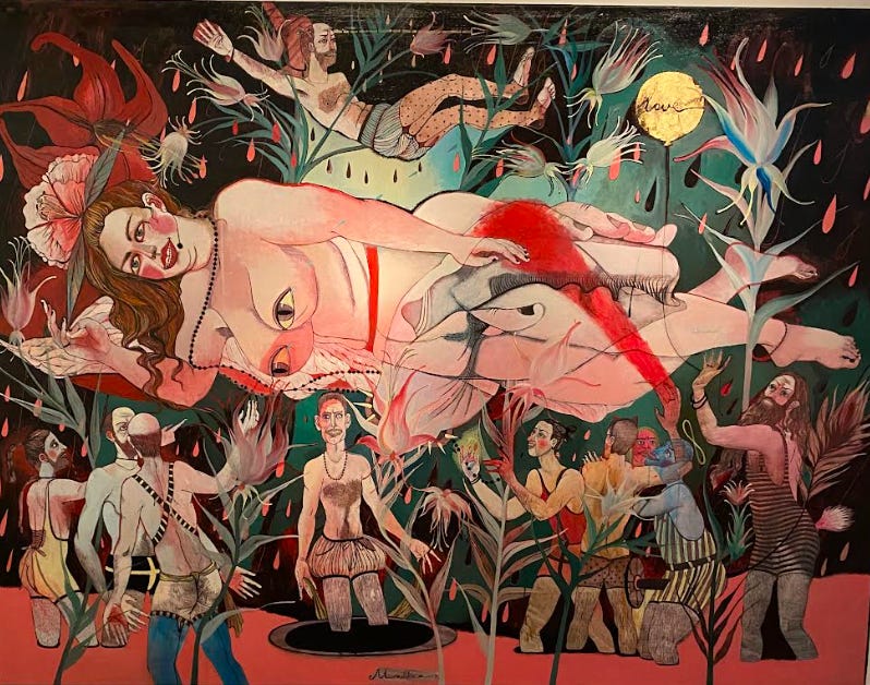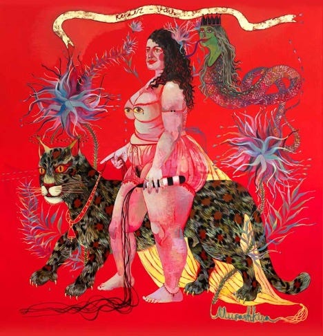 Nina Murashkina’s new art exhibition, “Her Beasts,” at the John D. Mooney Foundation in Chicago is well-worth checking out. According to some introductory remarks she offered those assembled at her opening on May 29th, her work is meant to depict a world where a woman shines and a man supports her—facilitating the glow-up. I could certainly see that reflected in some of the artworks on display: there are paintings and drawings in which a male cranium literally supports a woman sitting on top of it, for example. But I detected a certain impish irony in her remarks. It felt like there was something else going on in her visions, beyond encouragement to smash the patriarchy. These artworks aren’t limited to a political statement. They’re not a pamphlet in paint but significantly transcend that station, touching the magical and archetypal. It’s refreshing to run into artwork that quarries down to the subterranean level and gains access to the territory of wish and dream in an unfamiliar yet recognizable way. Primarily, Murashkina’s paintings transmit an erotic, pagan dream—or, quite often, a nightmare.