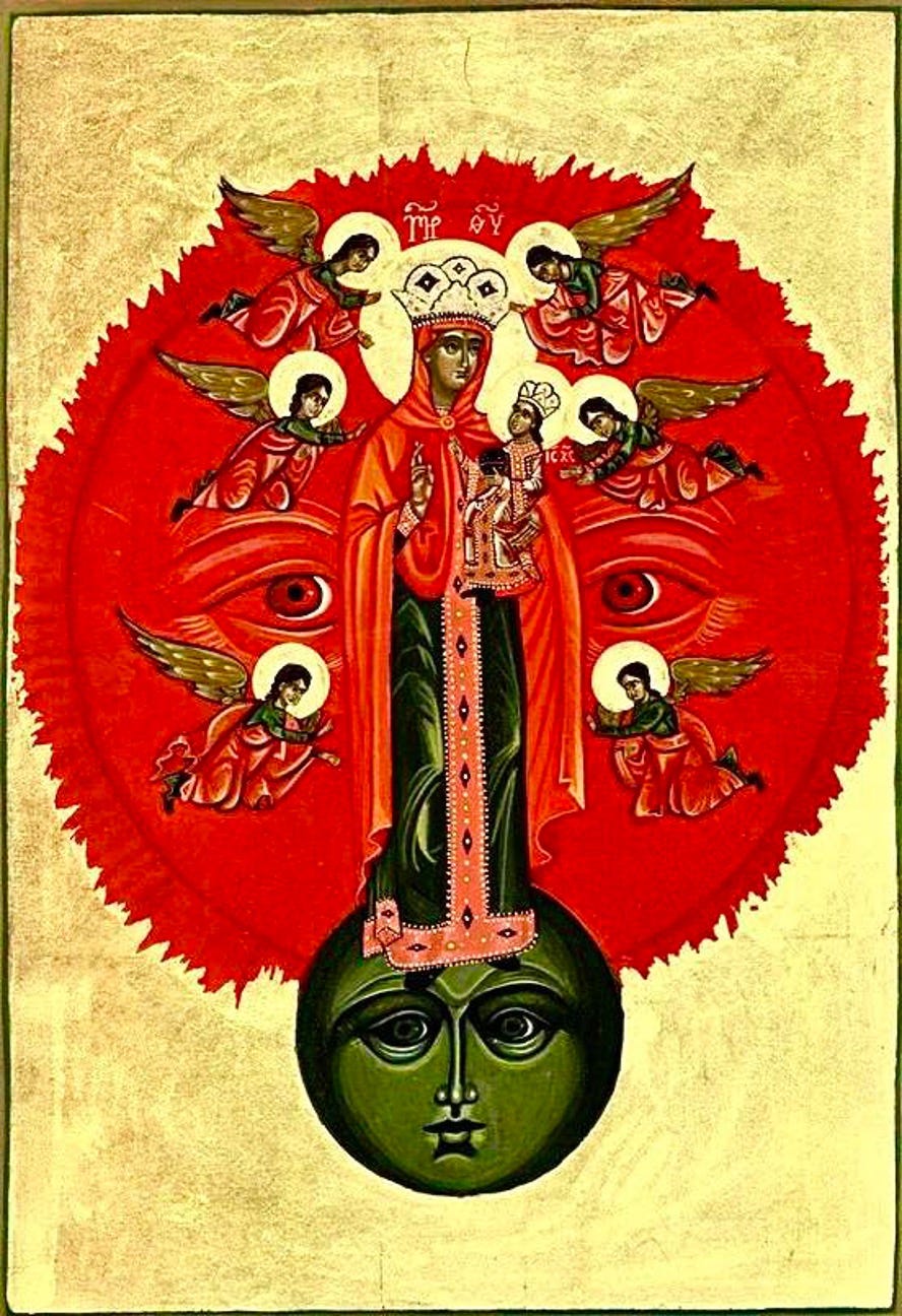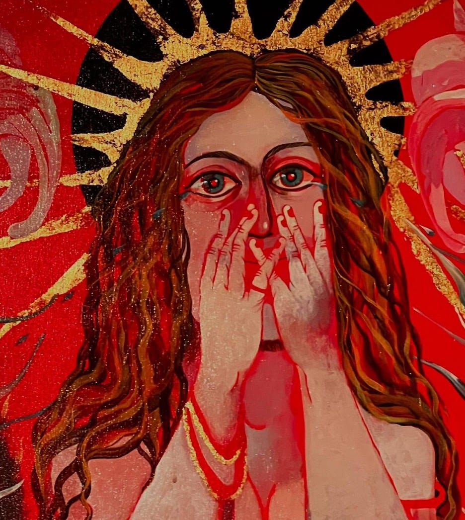 Murashkina is from Ukraine, and these varied influences are subsumed in a vision that is both personal and somehow unmistakably Slavic. Witness the notable use of gold leaf and red background, perhaps slightly reminiscent of Orthodox icons like this version of “The Woman Clothed with the Sun”: